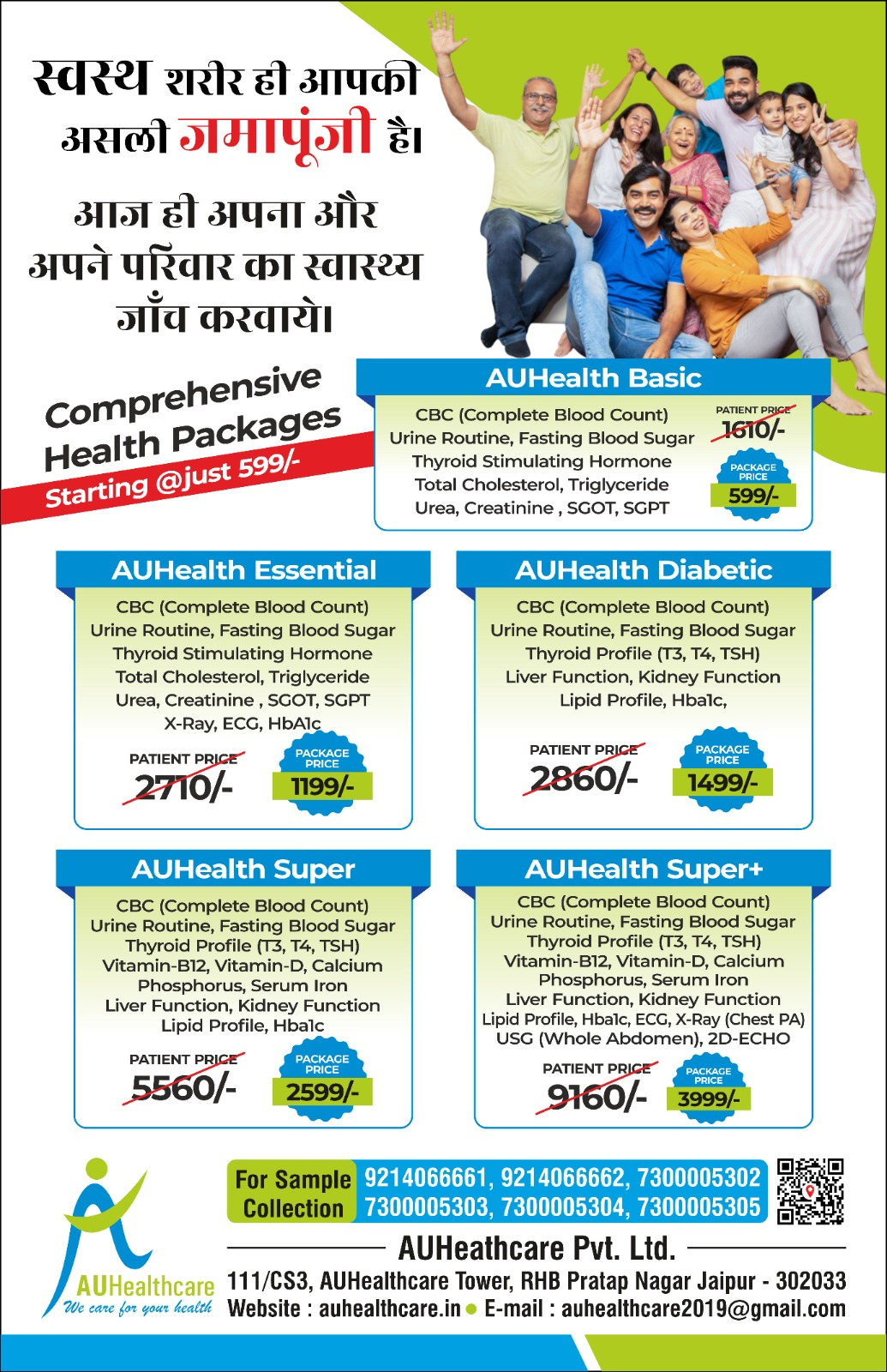 AUHEALTHCARE PVT. LTD. is a trusted name in advanced diagnostics and preventive healthcare in Jaipur. With a mission to deliver accurate, timely, and affordable diagnostic services, we are committed to enhancing patient care through cutting-edge technology, experienced professionals, and a patient-first approach.